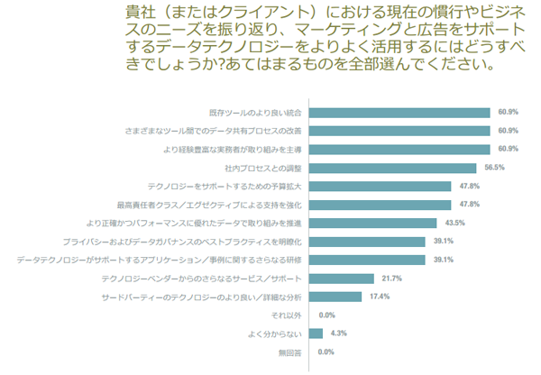 データテクノロジーから価値を引き出すことについては、そのツールセットの出所がどこであれ、統合が大事だと回答者は述べる。パネリストの60%以上は「既存ツールのより良い統合」が、データから大きな価値を引き出す上での一助になると答えた。