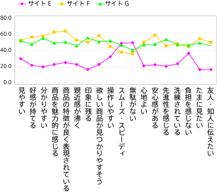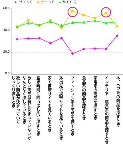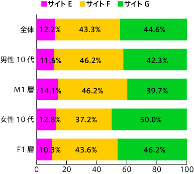 商品検索結果時に、商品毎の区別による好みを尋ねたところ、サイトE(区切り線なし)に比べ、サイトF(区切り線あり)、サイトG(区切り線あり+背景色違い)が提示した全ての利用シーにおいて支持された。さらに、『ファッション系の商品を探すとき』、『インテリア・寝具系の商品を探すとき』では、際立ってサイトFの支持が高かった。商品選定において、画像が重要視される分野では、背景が白バックの方が支持される傾向があると推察される。