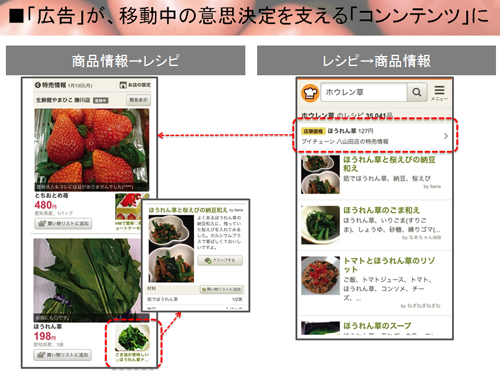 売り場の店員が「その日のおすすめ商品」をスマホから掲載すると、消費者がレシピとともにその「おすすめ商品」を見て、「その日」の買い物に出かける。つまり、クックパッドはこれまで折込チラシで提供されていた情報を、スマホから見れるようにして、消費者に働きかける仕組みを提供するというわけだ。また店員は店頭で利用できる販促ツールをダウンロードして、スマホを見て来店した消費者向けに活用することができるようにした。沖本氏は「女性の就業率が高まる中、夕方は忙しい時間帯。そこで広告をコンテンツ化して魅力あるものとしてリアルタイムで提供することが鍵になる。それが成功すれば、“店頭”から“移動中のスマホ”に買い物の意思決定のタイミングが移行するだろう。このテストケースでは来店数や購買数が15~20%程度上がった」と効果を強調した。
