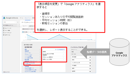 →Google アナリティクスレポートメニュー(AdWords)へのデータ表示