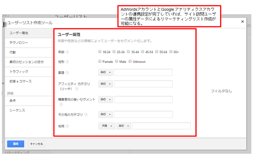 AdWordsとGoogle アナリティクス連携を行なうことで、これらユーザー属性と興味関心カテゴリのデータもGoogle アナリティクスのレポート画面で閲覧すことが可能になります。つまり、実際のサイト訪問者についてのユーザー属性、興味関心カテゴリデータを、推定データに基づいているものではありますが閲覧することが可能になります。そしてこれらのデータによるレポート画面上でのセグメントや後述するリマーケティングリスト作成のためのデータとしても活用することができます。