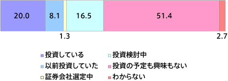 全体で、「投資をしている」20%、「以前投資していた」8%で28%が株式投資を経験しており、「証券会社選定中」1%、「投資検討中」17%から、今後の株式投資意向者は18%だった。