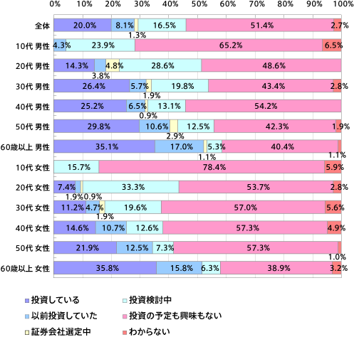 性・年代別では、男女共に世代が上がるほど投資経験者の比率が高く、60代では、男女共に約5割以上が株式投資の経験を持つ。また、投資を検討するのは20代がピークとなり、男性の29%、女性の33%が株式投資を検討すると答えた。