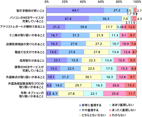 証券会社の選定で重視するポイントについて尋ねたところ、1位は「手数料が安いこと」が91%、次いで、「パソコンのWEBサービスが充実していること」84%、「アナリストレポートが無料」60%だった