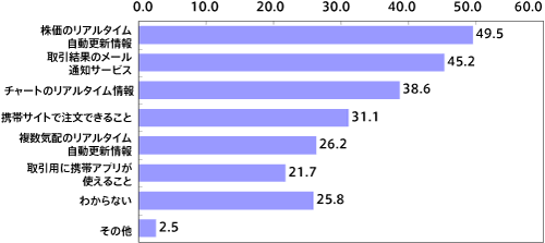 携帯サイトに求める機能・サービスを尋ねたところ、1位は「株価のリアルタイム自動更新情報」50%次いで、「取引結果のメール通知サービス」45%、「チャートのリアルタイム情報」39%でした。