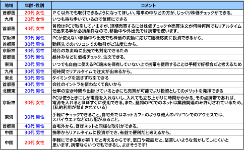 また、携帯サイトや携帯機能を株取引に使いたい理由を自由回答で尋ねたところ、「時間と場所を選ばずに、自由に株取引ができること」や、「相場の変動に応じて臨機応変に取引できること」が大方の意見でした。