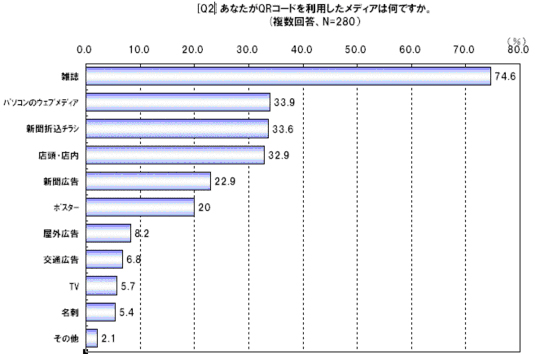 Q1でQRコードを利用したことがあると回答した280ユーザに聞いたところ、QRコードを利用した際のメディアでは「雑誌」が約75%と最も高く、次いで、「パソコンのウェブサイト」で約40%、「新聞折込チラシ」で約34%、「店頭・店内」で33%と続いた。QRコードを利用した際のメディアは、2位以下を40%以上の差をつけて、雑誌が断トツのトップとなった。
