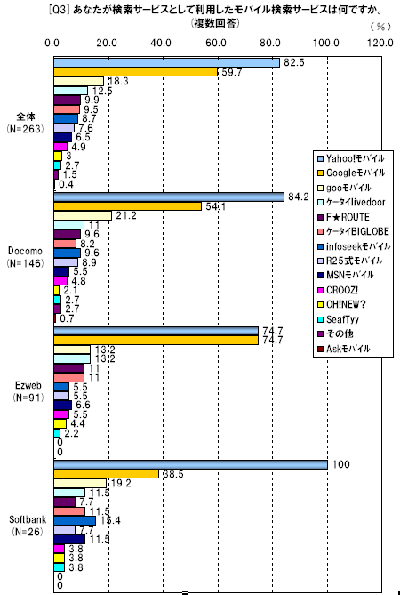 また、2006年9月にYahoo!ケータイは、携帯電話向けのYahoo! JAPANのトップページで、ソフトバンクモバイルの携帯電話機に搭載される「Y!」ボタンを押すだけで表示されるようになった(参照:ソフトバンクモバイル、ヤフーとの連携で無料コンテンツ拡充) 。ソフトバンクユーザーはこの影響によりYahoo!モバイルの利用率が他のモバイル検索サービスよりも高いことが予想される。ただ、ソフトバンクユーザーのサンプル数は26であるため、参考値としてみる必要がある。これらのことから、モバイル検索サービスの利用は携帯電話のキャリアが、どのモバイル検索サービスを押し出すのかが、利用率に影響を与えていると考えられる。