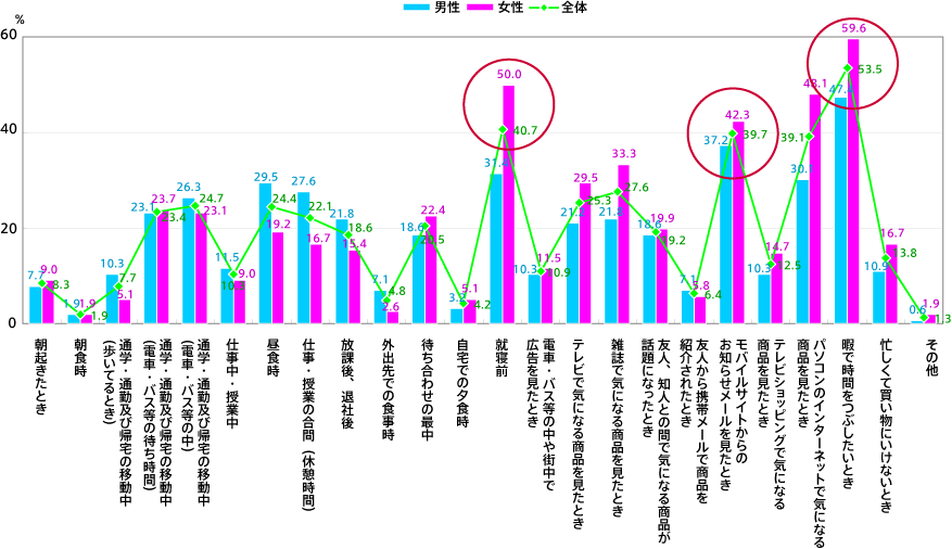 モバイルショッピングのピークは「暇つぶし」と「寝る前」