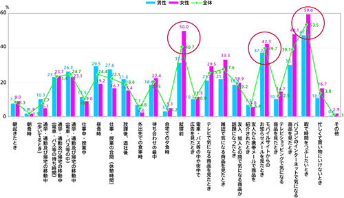 モバイルでショッピングサイトにアクセスするタイミングを尋ねたところ、「暇で時間をつぶしたいとき」(54%)が最も高く、次いで「就寝前」(41%)、「モバイルサイトからのお知らせメールを見たとき」(40%)となった。男女とも、「暇で時間をつぶしたいとき」が最も高く、女性では「就寝前」、「パソコンのインターネットで気になる商品を見たとき」が上位となり、男性では「モバイルサイトからのお知らせメールを見たとき」、「就寝前」が上位であった。