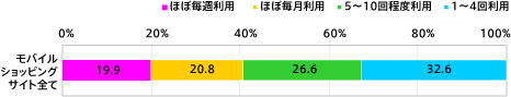 この1年におけるモバイルショッピングサイトの利用について尋ねたところ、「ほぼ毎週利用」(20%)、「ほぼ毎月利用」(21%)となり、全体の41%が月1回以上利用していると回答した。また、この1年間のショッピングサイト別利用経験では、「楽天」(72%)が最も高く、次いで「Yahoo!モバイル」(58%)、「Amazon」(56%)となった。