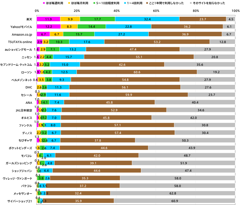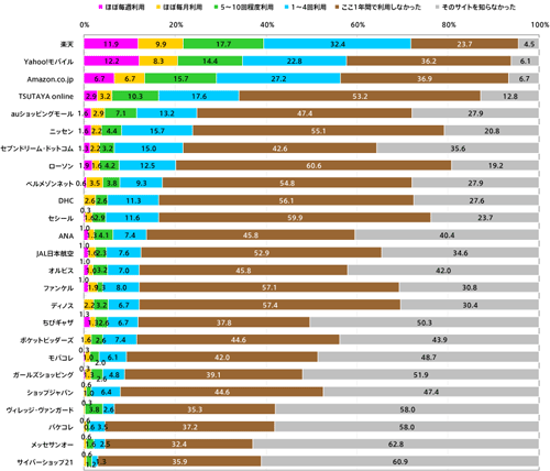 1年間でのショッピング経験1位が「楽天」、次いで「Yahoo!」、「Amazon」