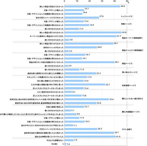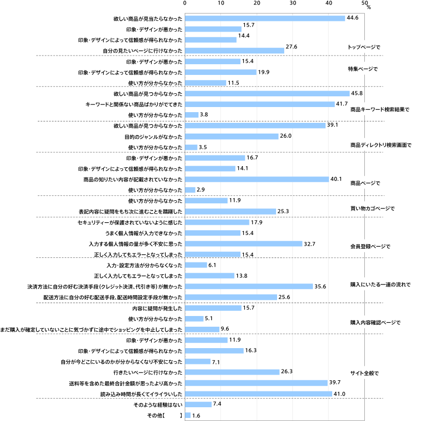 全体的に、何らかの理由でほしい商品まで到達できないことが、購入への障壁であることが伺える。また、商品や価格に関する情報提供の不足も購入を中止する原因となっているようである。