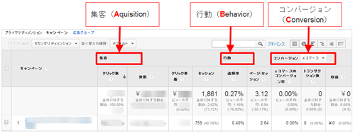 Google アナリティクスの標準的なレポート形式では、以下のように「キャンペーン」などのディメンションごとに「集客→行動→コンバージョン」の流れが確認できる指標でテーブルが組まれています。