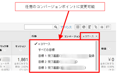 「コンバージョン」の部分は、計測しているすべてのコンバージョンポイントを自由に選択することができます。キャンペーンの目的ごとに成果を確認する場合に非常に便利です。