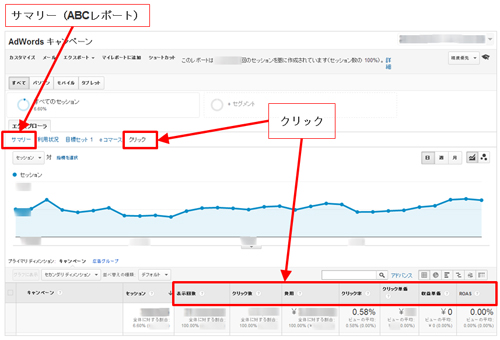 AdWords側のレポートでは、キャンペーン、キーワード、広告ごとの掲載レポートを確認することができますが、リンク先URLごとの集計レポートは用意されていません。Google アナリティクスのレポートではリンク先URL(広告のランディングページ)ごとのABCレポート、ならびにクリックレポートを確認することができます。
