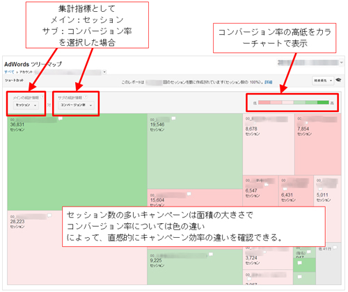 ツリーマップ:AdWordsアカウントごとに指標値をツリーマップ形式で見るレポート