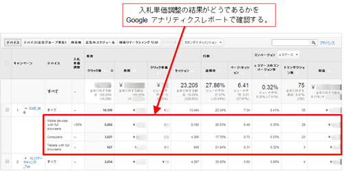 キャンペーンの設定で入札単価調整を行っている場合は、その単価調整の設定がそのまま自動的にGoogle アナリティクスにインポートされ、入札単価調整を行った結果のレポートをGoogle アナリティクス側(ABCレポートやクリックレポート)で確認することが可能になります。