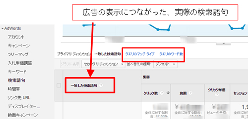 「検索語句」とは、広告の表示につながった実際の検索語句のことです。AdWords側のレポートでも「検索語句」レポートがあり確認できます。