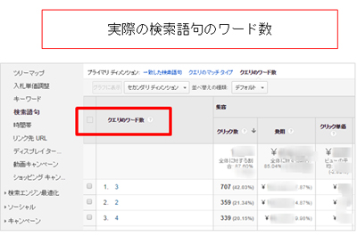 Google アナリティクス側のレポートでは「一致した検索語句」「マッチタイプ」に加え「クエリのワード数」ごとの集計も確認することができます。
