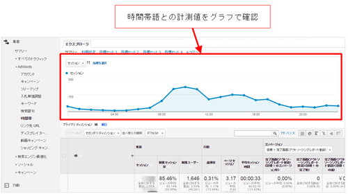 AdWords側のレポート「キャンペーン>広告のスケジュール」でも曜日と時間帯ごとの掲載レポートを確認し、入札単価調整に活用することができますが、Google アナリティクスの「時間帯」レポートでは折れ線グラフ表示でより見やすくなっています。また、ABCレポート形式でサイト内行動とGoogle アナリティクス側で設定したさまざまなコンバージョン計測値を確認することができます。