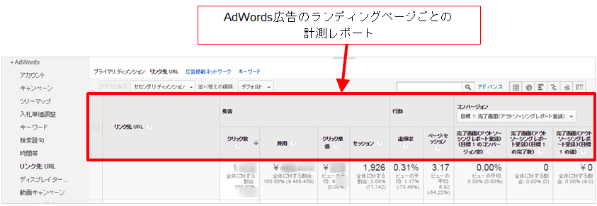 リンク先URL:広告のリンク先URLごとの計測レポート