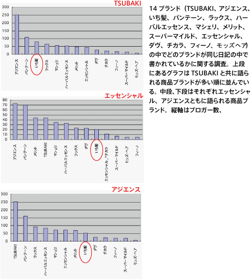 ブログの中を読んでみると、「TSUBAKIがなくなったので今度はいち髪を買った」とか、「TSUBAKIといち髪はコンセプトが似ている」とか「TSUBAKIといち髪の仕上がり具合いの違いを比較した」というものである。このようにブランド同士を比較すれば、どの商品とどの商品が消費者にとって類似品と考えられているのかが見えてくる。ちなみにここ半年、TSUBAKIといち髪はあまり比較されなくなっている。