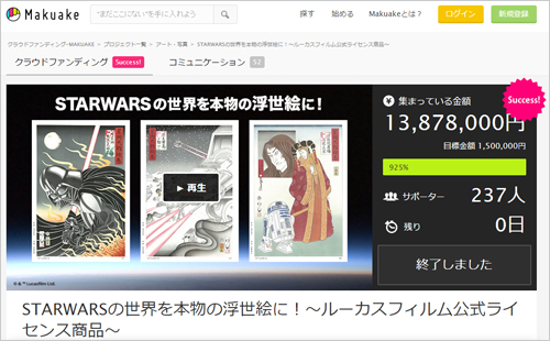 もう終わってしまったプロジェクトなんですが、スターウォーズを浮世絵にするというプロジェクトがあって、1400万円近く集まったんです。木版の浮世絵を3種類。絵師や刷り師などの職人さんを巻き込んで、本格的な浮世絵でダースベイダーやR2-D2を描いています。ちゃんとルーカスフィルムの公認ももらっているので、クレジットも入っています。