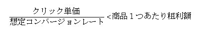 コンバージョンレートが1%だとすると、1人のお客様を獲得するためには、クリック単価の10倍の広告費がかかるということです。つまり、左は「新規顧客獲得コスト」だといえます。コストが利益の額を下回るように考えて出稿しましょう。
