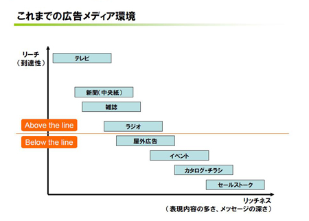 上の図は「ホリスティック・コミュニケーション」 (秋山 隆平, 杉山 恒太郎/宣伝会議)という書籍から引用・編集したものです。従来は4マスと呼ばれるテレビ、新聞、雑誌、ラジオは「多くの人に届けられるけど、表現力は弱い」とされてきました。逆に、対面販売のセールストークやカタログ、イベントなどでは「少人数相手になるけど、伝えられる内容は大きい」とされてきました。つまり、リーチ(到達性)とリッチネス(表現量)はトレードオフの関係にあったのです。