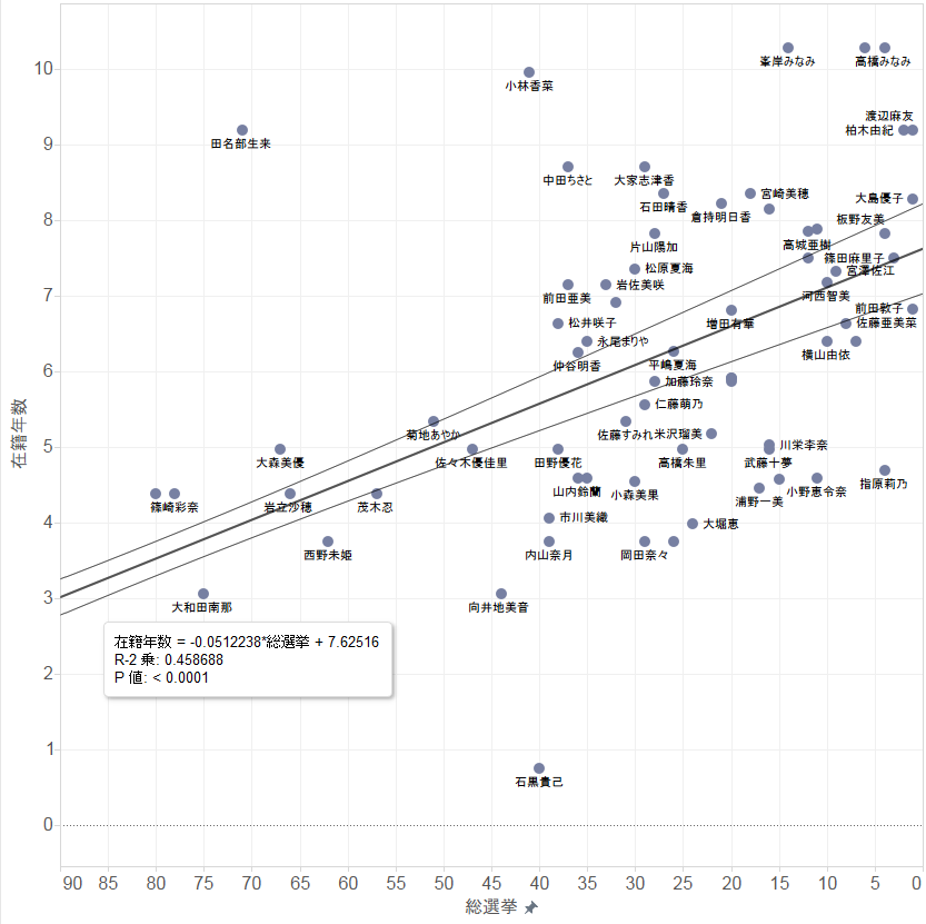 横軸に総選挙の最高順位(反転)、縦軸に在籍年数をとっています。総選挙で100位以内に入っているメンバーに絞られている点には注意が必要です。推定された係数からは総選挙の順位が一つ上昇すると、在籍年数が0.05年増加する傾向となっていました。