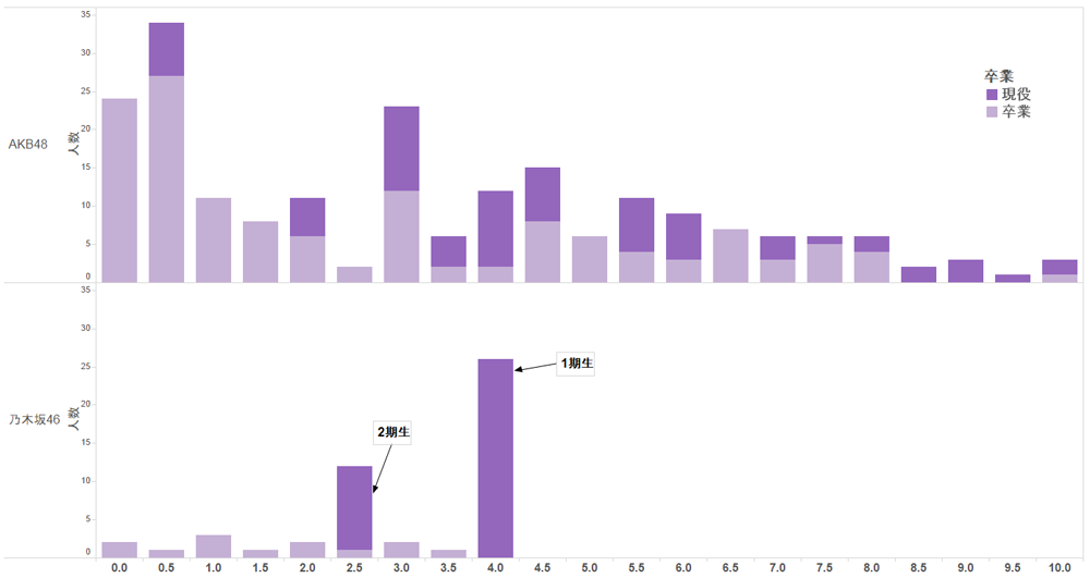 両グループ共に、在籍年数が2年以下で卒業しているメンバーが多く存在していますが、これは研究生のまま卒業したケースであると考えられます。乃木坂46については、4年と2年に集中しています。これは、乃木坂46は過去2回しか実施されていないためです。AKB48のオーディション回数は15回、ドラフト会議は2回を数える歴史を持ちます。凄っ。