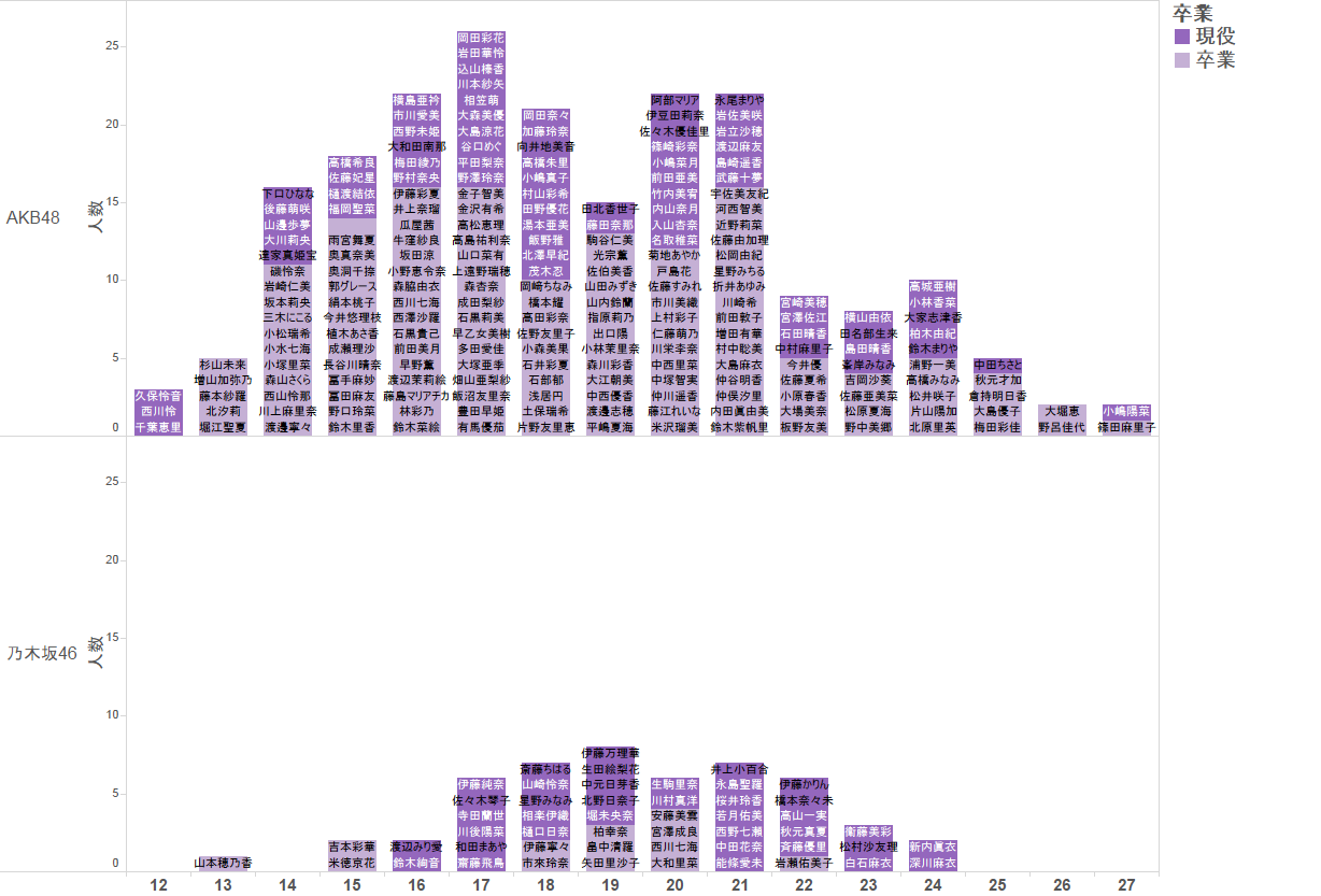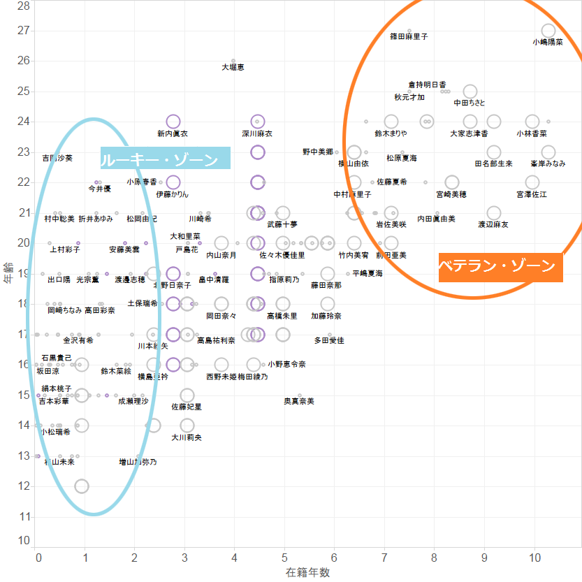 左のルーキー・ゾーンから徐々に在籍年数と年齢を重ねて、右上のエリアであるベテラン・ゾーンへ向かうことになります。左下のルーキー・ゾーン、つまり研究生の時期に卒業してしまうメンバーも多いですね。また、卒業年齢に注目すると20歳以下が多いようです。秋元才加さん、倉持明日香さんの25歳というのはかなり年上であることが示唆されています。