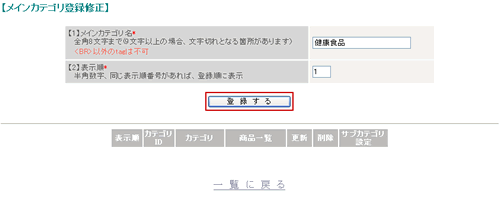 テキストリンクをクリックすると【メインカテゴリ登録修正】のページが表示されます。表示されたら、「【1】メインカテゴリ名」の項目にカテゴリ名を入力します。続いて「【2】表示順」の項目も入力してください。なお、「【2】表示順」は、入力した数値が小さいものを先頭にして、構築したショップサイトに当該カテゴリが表示されるようになっています。