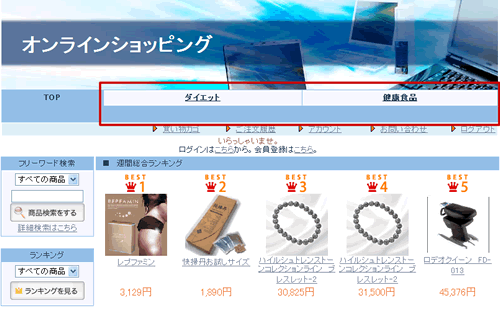 下記画像の例は、「ダイエット」というカテゴリと「健康食品」というカテゴリの2つを作成し、それぞれの表示順数を「ダイエット」を1に設定し、「健康食品」を2に設定した場合の表示になっています。