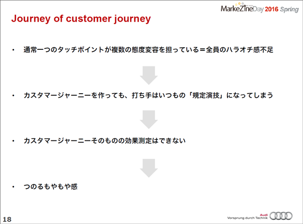 続いて、アウディジャパン井上氏から「テーマ2:顧客体験をより本質的に捉えてプランニングに活かす」と題したプレゼンテーションが語られた。井上氏は開口一番「『カスタマージャーニー』という言葉自体がバズワード化している中で『カスタマージャーニーのジャーニー』といいますか、カスタマージャーニー作成において陥りやすいパターンがあるのではないでしょうか」と疑問を呈し、自身の体験談を元に次のように述べた。