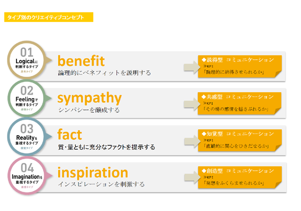 指標として、まずはこの「思考タイプ」「感情タイプ」「感覚タイプ」「直感タイプ」の4タイプのターゲットがいると想定してクリエイティブを作成していきます。