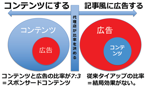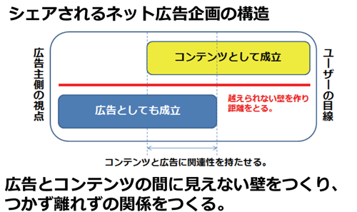 単なる商品や企業の持ち上げになるか、それともコンテンツとしての成立度を求めるかを最初に決める必要があるのです。しかし、これまでの広告コミュニケーションがユーザーに受け入れられなかったわけですから、商品や企業のPRに偏りすぎると、今までと何ら変わらないでしょう。