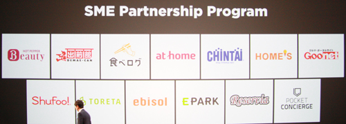杉本氏は「オープン化」の2つ目として、飲食や小売店鋪など中小規模の事業者向けに提供してきた「LINE@」の活用を推進するため、「SMEパートナーシッププログラム」を開始すると発表した。同プログラムでは、店舗向けWebサービスを提供している事業者をSMEパートナーとして認定。パートナーには13社が選ばれている。