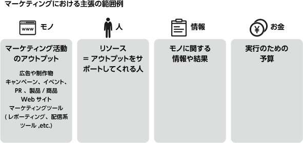 今回のコラムの対象読者は、日々現場で活躍するマーケティング担当者と想定している。マーケティングにおける主張の範囲は、その業務の裏返しといっていい。まず、「モノ」としてのマーケティング手段がある。例えばキャンペーンや広告展開、製品のローンチ。そして、そこに関わる「人」がいて、制作やプロジェクトを進めるための「情報」が必要となる。最後は、実施するための「お金」である。マーケティングにおける“主張”は、この要素の組み合わせでできている。