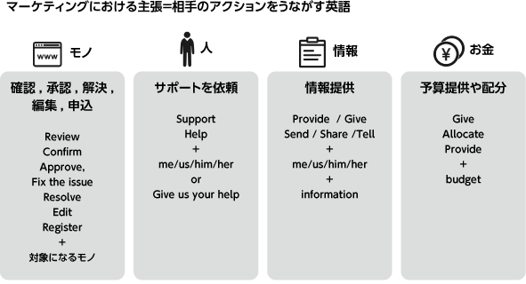 いくつか主張の例を挙げたが、マーケティング業務における主張や、それをサポートする理由の説明を軸に考えると、使う単語やフレーズは限られてくる。英語の会話を構成する軸は、相手へのアクションの要求やこちらの状況の理解を促すことである。
