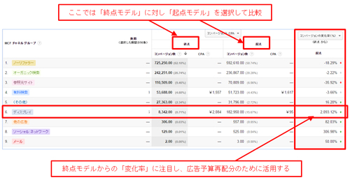 上図で注目すべきは「ディスプレイ」チャネルですが、終点モデルでは「8,342件」のコンバージョン数で有料検索チャネルによるコンバージョン数「53,688件」よりもかなり少ない値になっています。(かつ、CPAも悪いので)ディスプレイ広告施策への評価を下げざるを得ない結果に見えます。しかし、起点モデルでは、ディプレイチャネルからのコンバージョン数は「182,950件」と大幅に増えているのがわかります。その増え方が変化率として%で表示されています。これを見ると、ディスプレイ広告にもっと積極的に予算投下をすれば、全体のコンバージョン数を効率的に増やすことができそうだという意思決定の材料になります。