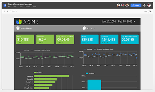 Google アナリティクス 360、BigQuery、Googleスプレッドシートからのデータインポートが可能。画面上のUI操作で自由にレポートを作成することができる。デザイン要素も高く、ビジュアライズされたレポートの提供が可能になる。
