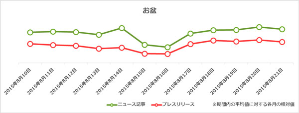 お盆の期間は8月13~16日。15~16日は土日だったので記事数、プレスリリース数ともに減少していますが、お盆前半の13~14日、またお盆直後の17日は記事数がほぼ通常通りに回復しています。特にお盆前半の13~14日はプレスリリース数の減少に比べて記事数は通常通りの数をキープ。まさに“ライバルが少ないタイミング”といえます。
