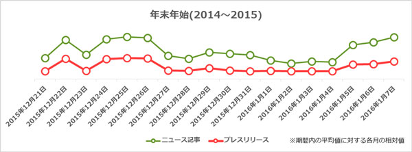 年末は12月29日から一気にニュース記事数が減少。プレスリリースの数も比例して少なくなります。もしも年末にプレスリリースを出すなら、ニュース記事数が減少する前に取り上げられるように27日までに出すことをおすすめします。