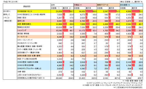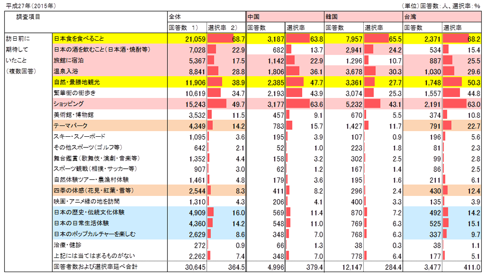 観光客全体の平均で見ると、「日本食を食べる」と回答した旅行者が68.7%と最も高く、2番目の「ショッピング」が49.7%と続いた。また、「自然・景勝地観光」38.9%、「繁華街の街歩き」34.7%に続き、「温泉入浴」、「旅館宿泊」、「日本の歴史、伝統文化体験」が多い結果となっている。その中で、「映画・アニメ縁の地を訪問」などいわゆる聖地訪問や「舞台、スポーツ鑑賞」などもあり、実に需要さまざまであると事が伺える。