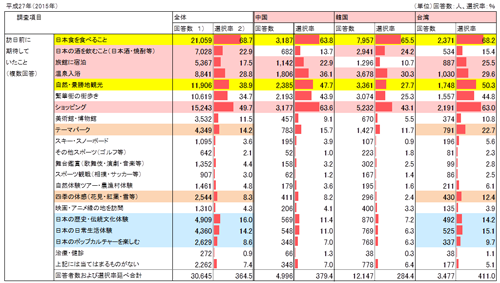 観光庁が1月にリリースしたデータを見ると、国、地域によって来日目的、来日中にしたいことが異なることが分かる。