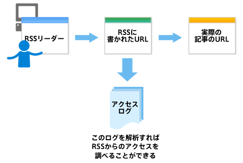 これを利用して、RSSからのアクセス専用のリダイレクトURLを用意し、それをRSSの各記事のURLとして指定しておくことで、RSSを経由したアクセスだけを、ログの中から見つけることが簡単にできるようになるのです。