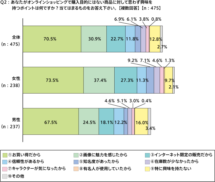 Q2で、オンラインショッピングで購入目的ではない商品に対して、思わず興味を持つポイントを男女別に尋ねたところ、女性では「お買い得だから」が73.5%と圧倒的に多く、男性でも67.5%と続く結果になった。