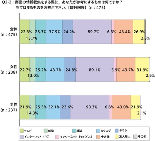 Q2-2では、商品の情報収集をする際に、参考にするものを尋ねたところ、男女共に「インターネット(PC)」が多く90%前後にのぼる結果になった。